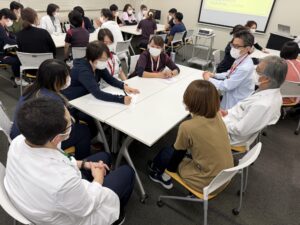 医療安全管理委員会委員長でもある大熊医師による講義のあと、多職種でのグループで、実例(トイレ内での付き添い・誤嚥が心配でミキサー食・押さえつけて吸引)を題材に話し合い、発表をしました。