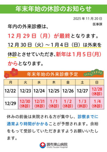 2025年 年内の外来診療は、 12月29日(月)が最終となります。