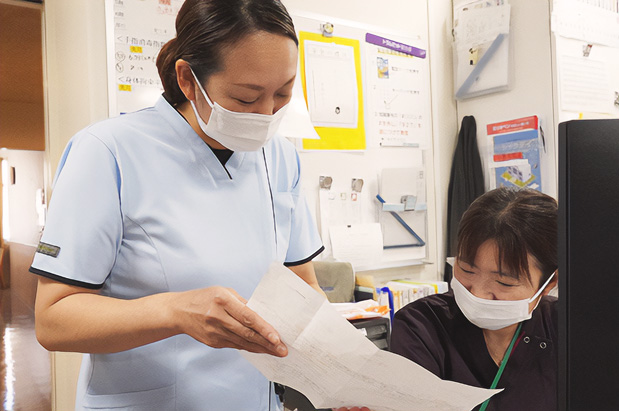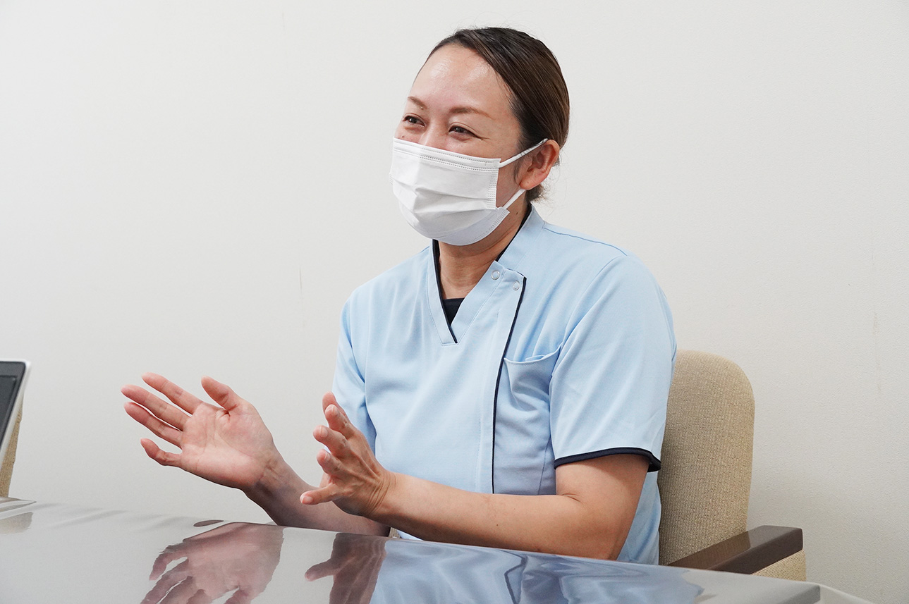 一方、東山病院では患者さんへのケアを看護師が中心に行うため、私たち看護助手はサポートや補助に専念できます。その分、安心して患者さんと丁寧に向き合えるようになりました。